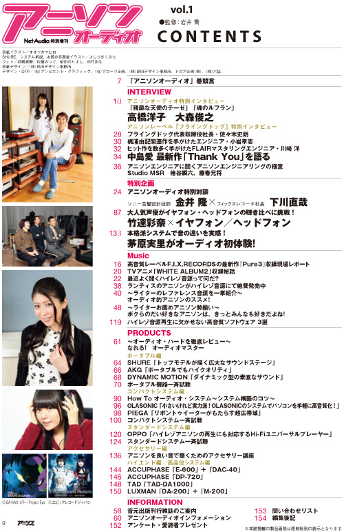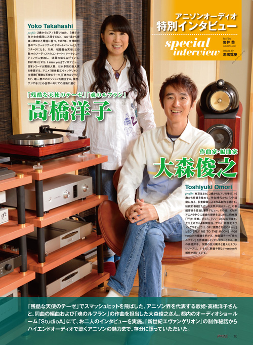 本誌では「残酷な天使のテーゼ」を歌った高橋洋子氏と、同曲の編曲を手がけ、「魂のルフラン」の作曲も担当した大森俊之氏に、特別インタビューを実施。『エヴァ』の制作秘話から、ハイエンドの機材で聴くアニソンの魅力まで、存分に語り尽くします。また、音質にも非常に気を配っている大森さんのスタジオにもお邪魔して、音楽制作へのこだわりもお届けします