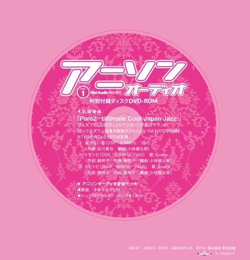 『ToHeart』や『WHITE ALBUM2』などの名作ゲーム・アニメを数多く生み出してきたアクアプラスの楽曲を手がけるF.I.X.RECORDS。高音質アルバム『Pure』シリーズがスマッシュヒットを飛ばしたことでも知られています。今回は、『Pure2 -Ultimate Cool Japan Jazz-』より、「届かない恋」「トモシビ」の特別な音源を付録DVD-ROMに収録いたしました。『Pure2』はSACDとしてリリースされていますが、今回収録したのは、マスタリング前の一発録りしたままのDSD音源に加え、「トモシビ」は96kHz/24bitのWAV音源も収録しています。