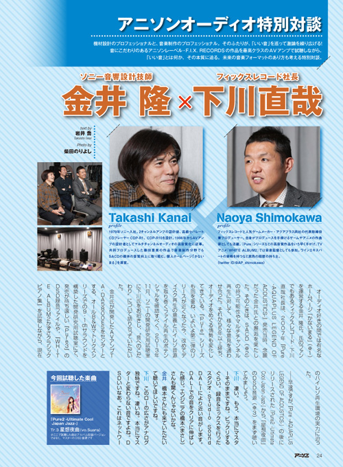 高音質アンプやプレーヤーを設計し、個人ホームページ「かないまる」も多くのファンに支持されているソニーの音響設計技師の金井 隆氏。そして、高音質CDを数多く手がけ、自身もオーディオマニアとして知られるF.I.X.RECORDSの下川直哉氏による特別対談が実現。機材設計のプロフェッショナルと、音楽制作のプロフェッショナルが「いい音」の本質とは何か、また未来の音楽フォーマットについて激論を戦わせます。
