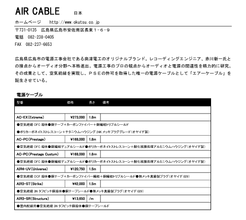 ●巻末の「ケーブルデータファイル」にて、AIR CABLE(奥津電工)と、ASUKA(アスカ工業)のラインアップが抜けていました。ラインアップと問い合わせ先は以下になります。