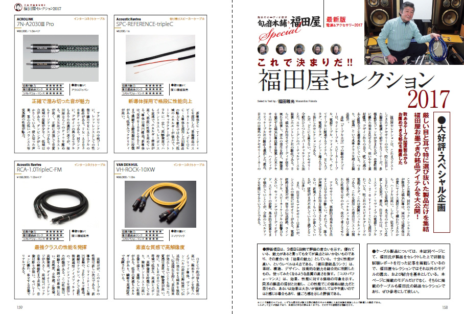 厳しい目と耳で選び抜いた製品だけを集結 『季刊・オーディオアクセサリー』誌の好評連載企画「旬の音本舗*福田屋」主人でもある、オーディオ評論家の福田雅光氏。膨大な数にのぼるアクセサリーの試聴を日々重ねるなかで、数あるケーブル関連製品から厳選し、お薦めできる銘品だけをご紹介する大好評のスペシャル企画です。とことん音にこだわる人必見のコーナーです。