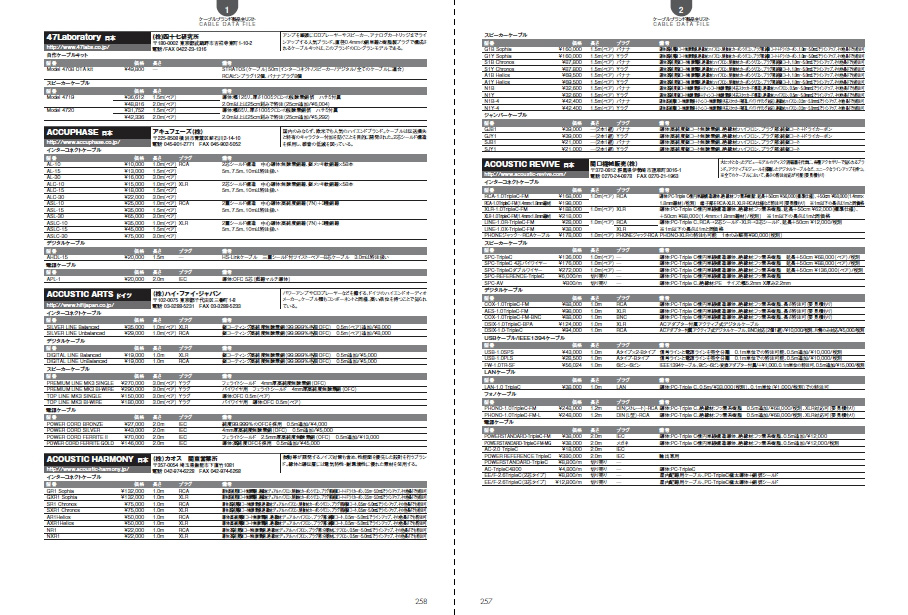 市販主要ケーブルをブランド別にジャンルごとに掲載する製品リスト&ブランド紹介リストです。それぞれのブランドの現行モデルのラインアップと取り扱い&問い合わせ先、ウェブサイトのアドレスとともに掲載しています。