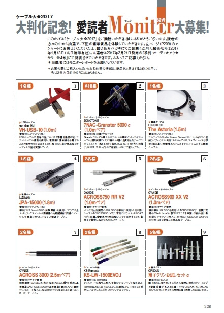 オーディオケーブルはいま変革の時代の真っ只中にあります。PCOCCの終了で新製品への切り替えを余儀なくされた一方、新たな導体がいくつも開発・導入されてケーブル設計に力が注がれ、クオリティ追求=大幅な魅力向上が図られています。一方、独自のこだわりを込め、ほかにはない魅力を持つブランドも一層磨きをかけた高みへと到達。こうした変革期を迎えたオーディオケーブルのいまを、どこよりも詳しくご紹介する『ケーブル大全2017』誌では、進化するケーブルをどう活かすべきか。音のプロ達10人が語るケーブル選びなどの新企画も盛り込み、アナログからデジタルハイレゾ、映像まで、ケーブルのいまを知り、より良い音と画を楽しむためのケーブル選びを「オールカラー記事&A4サイズ大判化」でさらに強力にサポートします。
