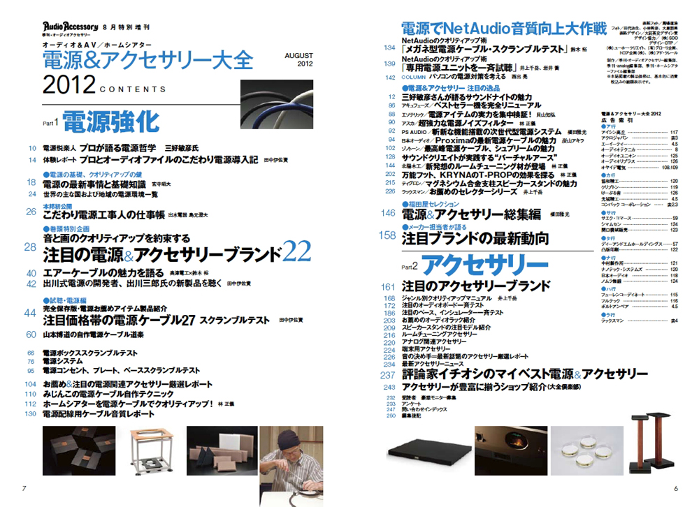 最新号では「電源の最新事情」に特にスポットを当てました。根強い人気の電源ケーブルの最新試聴レポートや注目の電源関連アイテム試聴のほか、200V電源など話題のオーディオ用電源工事も実例体験レポートでご紹介しています。さまざまなクオリティアップに必携のアクセサリー製品全般の情報に加え、いま最先端の分野「ネットオーディオ」の音質向上特集や、好評のマイベストアクセサリー、ショップ情報など、充実した内容で構成しています。