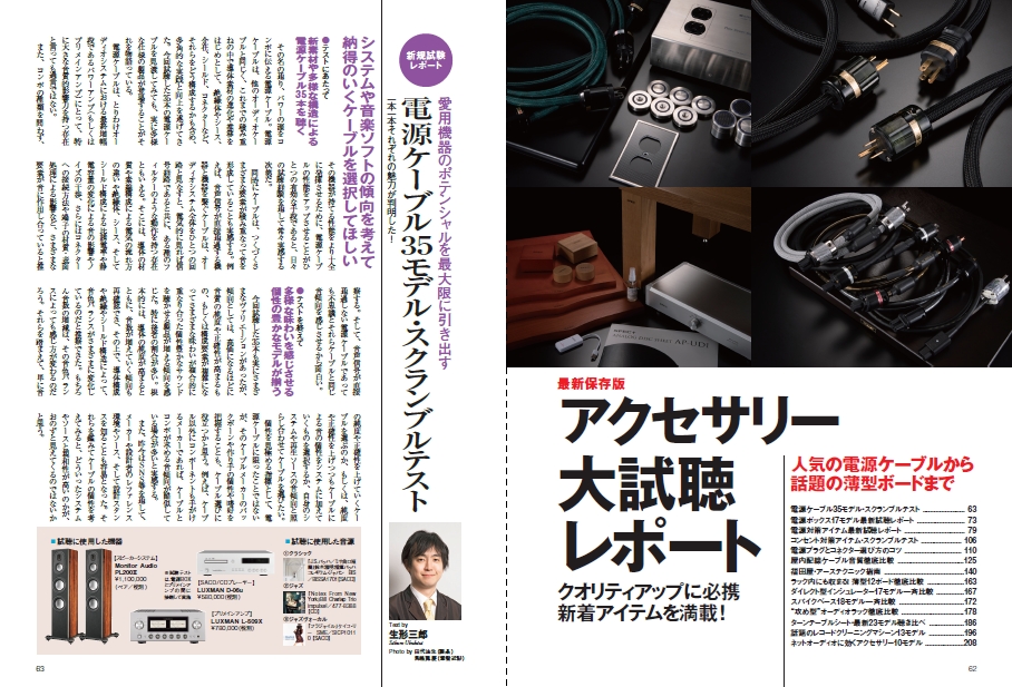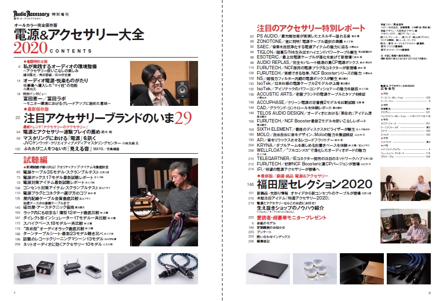『電源&アクセサリー大全2020』の目次 ●巻頭特別企画 私が実践するオーディオの環境整備 "より良い音で楽しみたい"という、誰もが持つ課題。それを自らの職業として日々、徹底して突き詰めているのがオーディオ評論家、そしてプロフェッショナルのエンジニア諸氏です。今号では特別企画として「音のプロフェッショナル」達がいま、自らのシステムで実践しているオーディオのクオリティアップ・テクニックのご紹介を満載しています。 オーディオ電源・悦楽ものがたり 仕事場へ導入した“マイ柱”の効能 小原氏は自宅仕事場のオーディオルームへ、「マイ柱上トランス」(通称“マイ柱”)を13年前の新築と同時に導入しました。近年、TVや海外著名報道機関でも報道されて『マイ電柱』として話題となった、このマイ柱の建立に至ったワケ、そして電源を重視すべき理由とは。オーディオ用電源工事の価値と効能について、実体験を語っていただきました。 特別インタビュー 冨田ラボ 移り変わる音楽シーンの最先端を走り続ける「冨田ラボ」が語る ミュージシャン/プロデューサー/作曲家/編曲家/ミックスエンジニア/マルチプレイヤー 数々のミュージシャンを手がけ、ヒット作を世に送り出してきたプロデューサーであり、セルフプロジェクト「冨田ラボ」として活動するミュージシャンとして、多彩な活動を通じて、音楽制作における全てにおいて最先端を走り続ける冨田恵一氏。氏にとって「オーディオ環境のグレードアップ」は、自身の作品のクオリティにも直結する極めて重要なテーマです。果たしてそのこだわりはどんなところにあり、冨田氏の作品へ反映されているのでしょう。電源、そしてアクセサリーでスタジオをさらにグレードアップさせ続ける氏の特別インタビューです。 最新保存版 ●注目アクセサリーブランドのいま29 クオリティアップのためのアクセサリー製品は、日々国内外のメーカーで研究が重ねられ、着実に進化し、効果もより大きな成果を生み出しています。ここではアクセサリーに注力する国内外のブランドから、いま特に注目すべきブランド29をピックアップ。それぞれのブランドがいま何に注力し、製品開発を進めているのか。最先端の技術開発やポリシー、そして最新のラインアップについて、さらに今号では、メーカーから読者の方々に向けたメッセージも掲載しています。 最新トレンド「アクセサリーのアクセサリー」