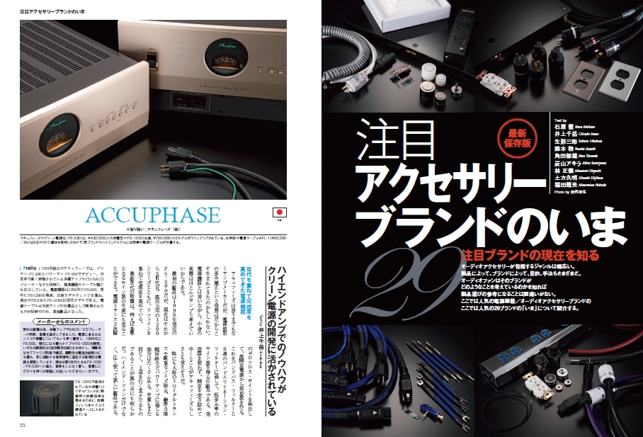 特別レポート ●注目のアクセサリー詳細レポート いま最も注目すべき、選りすぐりの最先端アクセサリーを特別にピックアップしてお届けする、詳細レポートです。本誌が初登場となる最新モデルから、人気モデルの使いこなし情報まで、話題の製品の仕組みや音の効果をひとつひとつ、じっくりと試聴レポートしています。アクセサリーとクオリティアップのための奥深いコツや、なぜその製品には効果があるのか。「アクセサリーの情報通」に捧げるディープな話題が満載です。