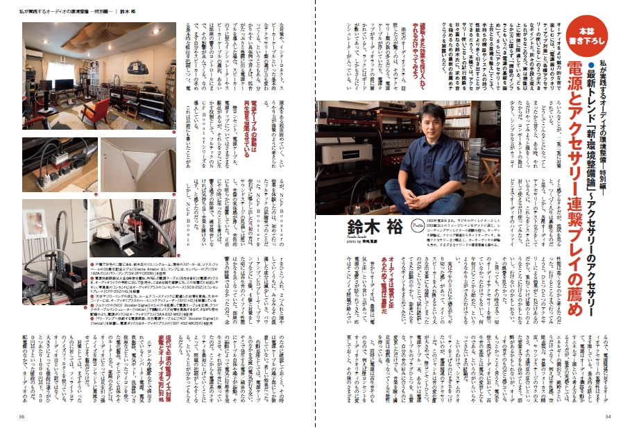 クオリティアップには「電源周り」と「アクセサリー使いこなし」の2つが大きなポイントです。別々の手段と思われがちですが、実は密接に関連しています。一方に偏らず「機器のインフラである電源の基礎を固め」て、さらに「アクセサリーで土台となる環境を整え」てこそ、手持ちのシステムは実力発揮に繋がります。ここでは「私が実践するオーディオの環境整備」の拡大版として、自宅システムで二重三重の対策、"アクセサリーのアクセサリー"でステップアップを図るオーディオ評論家、鈴木氏に最新テクニックを披露いただきます。 マスタリングにおける「電源」を訊く オーディオファンの手元に届く音楽ソースにとって、「マスタリング」は最終的な音のクオリティを左右する工程として、音源に込められた音楽性を決定づける重要なプロセスです。そのマスタリングでも、「電源」はやはり重要な意味を持ちます。日本でも有数の規模を誇るマスタリングスタジオで、最新のテクノロジーとそのセンスを生かし、幅広いジャンルにその手腕を振るう小林氏に、「電源」をテーマに存分に語っていただきました。 ふたたび二人をつないだ「見える音」 対談 ジャズシンガーとして17作目となるオリジナルアルバムをリリースしたMAYA。そして、ジャズオーディオ評論家として執筆活動の一方、「寺島レコード」をプロデュースする寺島靖国氏。かつて寺島レコードで多くの作品をリリースしたMAYAですが現在は移籍し、二人の関係は疎遠になったと思われていました。しかしいま「音楽とオーディオ」という共通の課題に、それぞれの「見える音」という共通点を見出し、再びオーディオ界に新風を吹き込もうとしています。二人の感じるそのキーワード「見える音」とは。インタビューからぜひ感じ取って下さい。 試聴編 ●新規試聴が盛り沢山! クオリティアップ・アイテムを徹底探査 クオリティアップを実現させるには、オーディオシステムの性格や自らの求める音、そして電源を含めた使用環境を把握した上で、求める要素に合ったアイテムを的確に採り入れることが大切です。この試聴編は、人気の電源ケーブルから話題の薄型ボードまで、ジャンルごとにクオリティアップに必携と言えるアイテムを満載し、1モデルずつ聴き比べた詳細な音質レポートを掲載しています。特に電源ケーブルは本誌のために35モデルが大集結、『季刊AudioAccessory』誌でも近年に類例のない一斉スクランブルテストとなっています。進化した最先端の効果を吟味するために、ぜひ各記事をお役立て下さい。