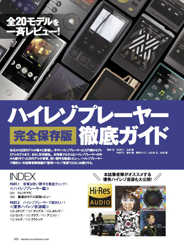 今やハイレゾプレーヤーは、入門機からプレミアムモデルまで、まさに百花繚乱。本特集ではそんなハイレゾプレーヤーのなかから選りすぐった20モデルの音質、使い勝手を徹底レビュー。ハイレゾプレーヤーで聴きたい本誌筆者陣推薦の“優秀ハイレゾ音源”とともにお届けします。 <掲載モデル> 特集厳選プレミアムヘッドホン