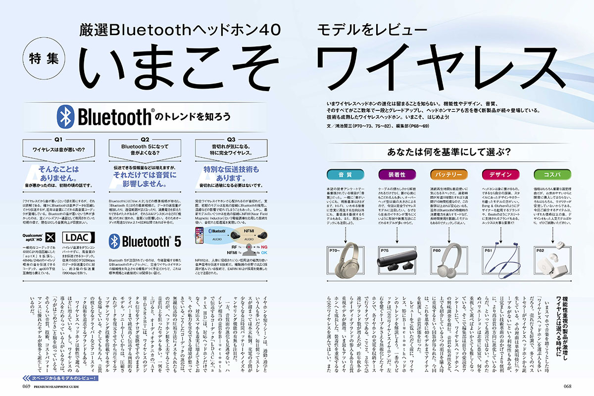 Bluetoothイヤホン&ヘッドホン厳選40+α ワイヤレスヘッドホンの進化が止まりません。装着性、再生時間、デザイン、コスパ、そして肝心の音質もヘッドホンマニアが舌を巻くほどにグレードアップ。成熟期を迎えつつあるワイヤレスヘッドホン厳選40モデル+αをオーディオ評論家が徹底レポート!ほしいワイヤレスがきっと見つかります。 <掲載モデル> インタビュースカルキャンディー本社を直撃!
