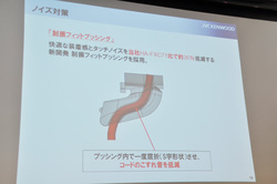 「そうですね、これまでもクリップを使って衣服に挟み込むことでタッチノイズはある程度緩和できましたが、ヘッドホン自体でどう軽減するかについてはずっと課題としてきました。そこで目を付けたのがブッシングでした。さらにノイズ低減のヒントとなったのはFXC71などで使っていた制振ジェルです。ブッシングにジェルと同じ役割を果たす弾性素材を入れることで、ケーブルの擦れを吸収してくれるのですが、問題となったのは弾性素材の固さでした。本来のジェル状の方が吸収率は高いのですが、形状維持や見た目、耐久性の点で問題があるので、素材の固さも適度に持たせながら、擦れの軽減を両立できるものを選びました。加えてブッシングの中のケーブルがまっすぐのままでは、弾性素材に触れたり触れなかったりして効果が薄まるため、S字に蛇行させることで常に触れるようにしています」(浅香氏)