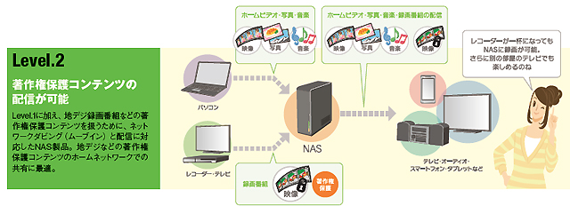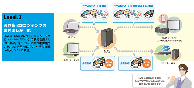 −−− DLPA NASでは、機能別にレベル1〜3まで規定されました。先行して発売されているアイ・オー・データ機器の商品やバッファローが7月上旬に対応予定しているものは、著作権コンテンツの書き出しまで可能な、最上位の「レベル3」になりますが、レベル分けの決定までにはかなり議論があったのでしょうか。