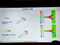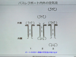 その問題を解決したのが、現在採用している「FR-Port(フラット・ラジアル・ポート)方式」だ。FR-Portでは両端を開き、平坦にした形状を採用した。このことで、空気が出るときに渦輪にならず横方向に広がることで、ノイズの発生を防ぐことができたという。また、空気が勢いよく排出されず、FR-Portの中のみで振動することで、十分な音圧が得られているという。