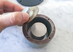 渡邉氏 ここにアルニコ型マグネットを使ったウーファーと、フェライト型マグネットを使ったウーファーがあります。フェライトマグネットはいわば陶磁器(セラミックス)で、フェライトという物質を焼き固めて作ります。一方でアルニコマグネットはアルミ、ニッケル、コバルトなどを鋳造した金属です。