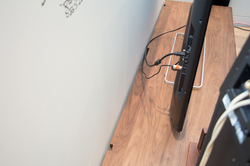 天板部は壁にぴったりと付けられるようになっていて、天板に置いたテレビやスピーカーをAVアンプに接続できるように、ケーブルを通す凹型の切り込みが付けられている。こうした仕様のおかげで、背面のケーブルは表に露出しない。