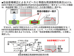 そこでダミーヘッドに起因する特性のガタつきを打ち消すため、あらかじめ測定したダミーヘッドの自由音場特性の “逆特性” フィルターをかけ、「自由音場補正」を行うことで、実際の聴感に近い周波数特性データを導き出す。JEITAではこれを「自由音場補正周波数特性」と定義し、規定した。