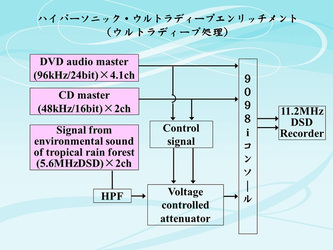 仁科:主にDVDオーディオ用のマスター(96kHz/24bit)と、そこに入っていないSEを復活させたり音の強さを出すためにCDマスター(48kHz/24bit)をもとにして、音楽信号とリンクするようVCA(Voltage controlled amplifire)回路で制御した熱帯雨林環境音の超高周波(5.6MHz DSD 2ch)を加えて、NEVEの特注コンソール「AMEK 9098i」でミックスしています。それを、大橋先生が独自開発した11.2MHz 8chレコーダーで録音しています。