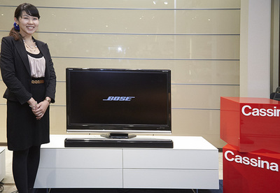 この特別展示に協力した(株)カッシーナ・イクスシーの新浜暁代さんが、今回のボーズの新製品を体験。実際の製品を見て触った感想、そして組み合わせた家具について語ってくれた。