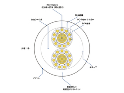 スーパーストラタム構造のもうひとつの特徴は、周辺導体の絶縁においてPFA(フッ素)絶縁を採用したこと。これにより電気特性が安定して、広い周波数にわたって安定した伝送が行えるとのことだ。