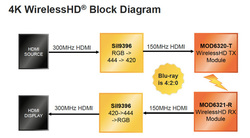 モジュールに内蔵されているSiBEAMのコンパニオンチップ「Sil9396」は、4K/30p/4:4:4(300MHzのHDMI信号)の映像がソース機器から入力された場合、映像の色信号に独自の変換処理をかけて4:2:0相当(150MHzのHDMI信号)にいったんマッピングし直してからトランスミッター「MOD6320-T」に無線で伝送。この信号をレシーバー「MOD6321-R」側のSil9396が再び4K/30p/4:4:4の信号に復元してディスプレイなどに送り込む。