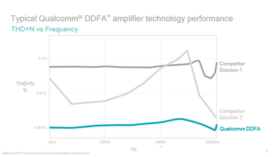 その効果は、クアルコム社が測定データとして明示している。一般的なアナログ方式のフィードバックを採用するアンプのTHD(全高調波歪)特性は、0.01%〜0.1%オーダーで、周波数によっても変化が大きいケースもある。
