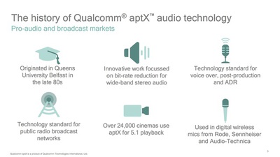McClintock氏によると、そもそもaptXはBluetoothに紐付けられたものではなく、音声圧縮コーデックとしてaptXが登場したのは30有余年前。MP3よりも長い歴史を持つという。aptXはイギリス・北アイルランドの首府であるベルファスト市にあるクイーンズ大学 ベルファスト校で誕生し、後にAPT社の技術として、放送業界やプロスタジオのブース間伝送などで広く採用されて行く。