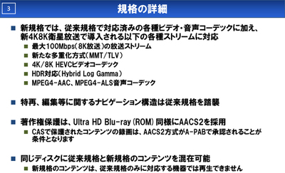 また今回の仕様では、同じディスクに従来のBlu-ray録画規格と、新規格のコンテンツを混在させて録画することも可能だ。これは地味ながら嬉しいポイントで、旧規格と新規格コンテンツを混在したディスクを既存の古いプレーヤー/レコーダーで再生した場合でも、旧規格で録画したコンテンツを再生できる。
