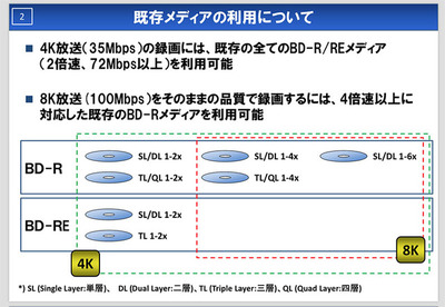 ただし4倍速以上に対応するBD-REは現状で存在しないため、100Mbpsの8K放送をそのまま録画する際には、基本的にBD-Rしか使用できない。