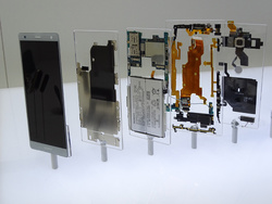 曲げた後に、側面のメタルフレームにピタリと合うように加工する技術にも熟練が必要。XZ2のリアパネルはガラスに反射する光の「流れと輝き」を表現している。XZ2 Compactは透明な樹脂素材の裏側から着色して、淡い色あいを表現した。表側にはフロスト加工をかけて光を拡散。手触りも心地よく滑りにくい。