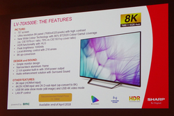 本機は日本で昨年12月1日に発売された“AQUOS 8K”「LC-70X500」(関連ニュース)からチューナーを省いた民生用機。シャープが昨年のIFA2017に出展した際、すでに欧州市場での発売を予告していた商品が、いよいよ店頭に並ぶことになる。