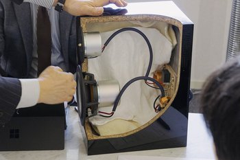 渡邉氏:スピーカーは、100年前から同じ仕組みであり、ボイスコイルに電流を流すとユニットに振幅が起こり、空気に放射することで音が発生します。スピーカーのボイスコイルは、発音機とジェネレーターの役目が一緒になってしまっているため、ボイスコイルのマグネットサーキットの磁界が、音を出すと同時に発電もしてしまいます。