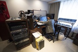まず、スタジオを見学させていただく。真ん中のキーボードとコンピューターを囲むようにプロ機器が設置された、マニアックな香りが立ち込める一室である。最新の機器とDAW(音楽制作ソフト)に、ヴィンテージ機器を介在させたシステム構成である。イコライザーとコンプレッサーはマンレイの真空管式、マイクアンプは、60年前のニーヴのもので、内部を信頼のおける技師に改良してもらっているという(しかもただ通すだけ、という使い方)。