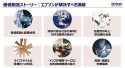 私たちエプソンの掲げる価値創造のストーリーは、社会課題に真摯に向き合い、解決することで、社会課題として6つのテーマを掲げています。その解決のために私たちは、「省・小・精の技術」をベースに、持続可能な社会、循環型経済をけん引していく。その実現のために「インクジェット」「ビジュアル」「ウエアラブル」「ロボティクス」の4つのイノベーションを起こします、というのが全体像で、まずこれを理解して欲しいと話しました。