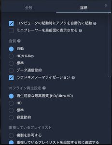 ラウドネスノーマライゼーションの設定は、PC用アプリやスマートフォンアプリに組み込まれている。デフォルトではオンになっていることが多く、例えばAmazon Music HDならば「設定」から「ラウドネスノーマライゼーション」のチェックを外すことができる。Spotifyならば「音量標準設定・すべての曲を同じ音量で再生する」という項目でオンオフが可能だ。