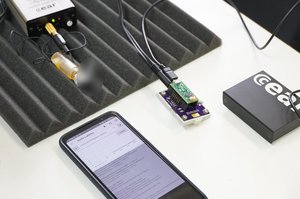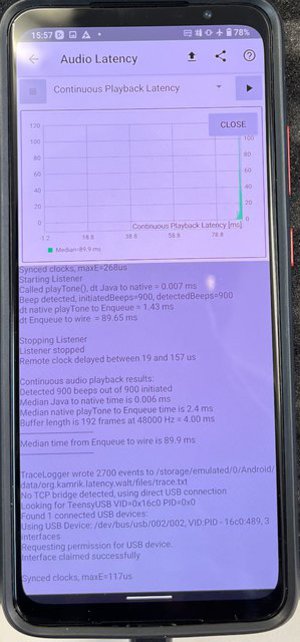 最初に遅延性能の評価の模様を見せていただいた。最新のSnapdragon 888を搭載し、aptX Adaptiveの96kHz/24bit伝送に対応するASUSが開発した「Smartphone for Snapdragon Insiders」から、左右独立型の完全ワイヤレスイヤホンに送り出されるパルス信号を、グーグルが推奨する「WALT Lataency Timer」アプリを使って測定する。