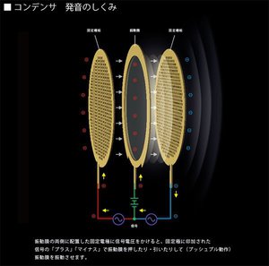 静電型、あるいはエレクトロスタティック型やコンデンサー型とも呼ばれる方式のヘッドホンは、とても薄い振動膜を2枚の電極板ではさみ、振動膜には常に電圧をかけておく。その状態で電極板に音楽信号を流すと、静電気によって振動膜がふるえ、音を発生させるという仕組みである。