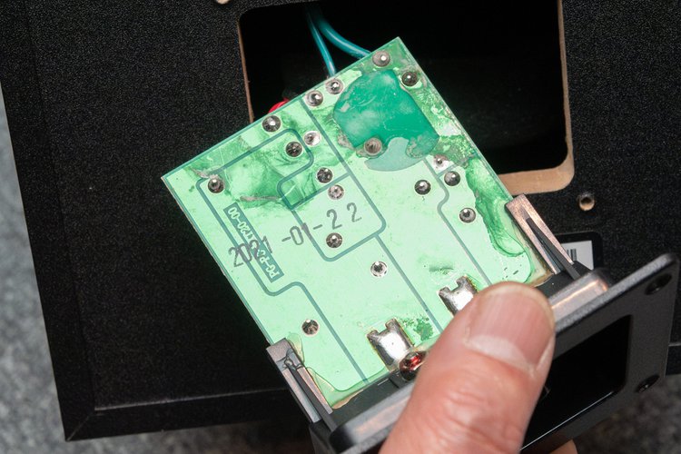 一方でトゥイーター側には、質の良い空芯コイルを使っています。しかもネットワーク基板をよく見ると、空芯コイルの裏側のパターンが抜かれています。これは近傍に導電物を持ってこない配慮ですね。空芯コイルはフラックス(磁束)が多く発生するので、その影響をなくすための工夫ですね。