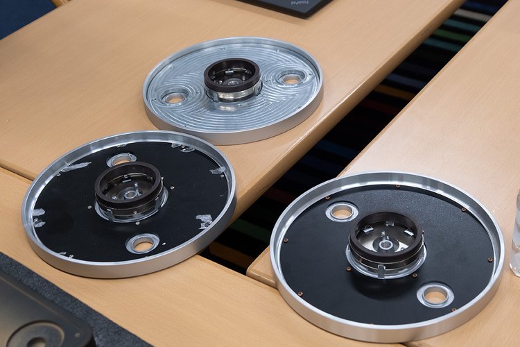 アルミダイキャスト製プラッターの裏側のダンピング材に関しても、亜鉛やスチール、ゴムなどを試したが、最終的にはステンレス(SUS304)が採用された。3mm厚にさらに黒塗装がされており、なおかつそれを止めているネジは銅ビスというこだわり様だ。2.8kgのプラッターのイナーシャは400kg・cm2と強大である。