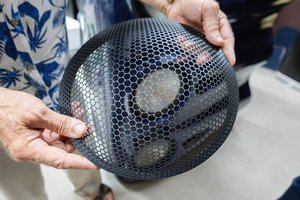 ローレンス:これは真空注入成形されたカーボンファイバーのコンポジットです。VIVID AUDIOのスピーカーにはすべてこの素材を使っています。真空の圧力で、グラスファイバーやカーボンを非常に強く圧縮させ、そこに樹脂を流しこむことで、軽くて曲げに強い強靭なマテリアルを作ることができるんです。これはレーシングカーや航空機などに使われている技術です。