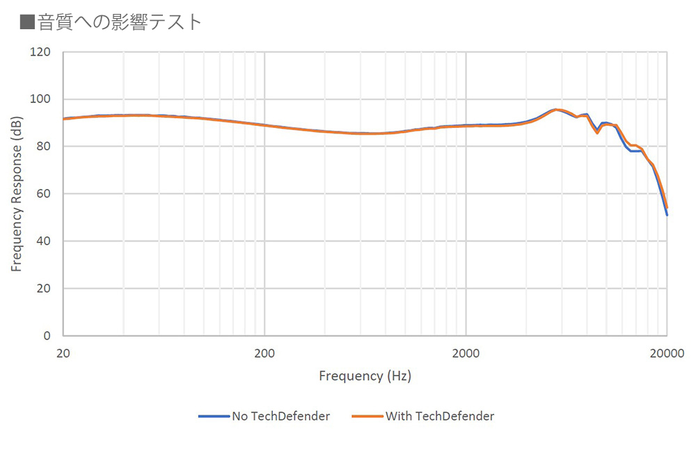 ぜひ皆さんに知ってもらいたいのが、テックディフェンダーは音質にほとんど影響しないよう設計しているということです。弊社の測定でも20Hzから20kHzまで、ほぼ均等に1dBだけ減衰させるという結果が出ています。つまりテックディフェンダーのせいで低域が強まったり、音がこもったりすることは無いので、安心して頼っていただきたいです。