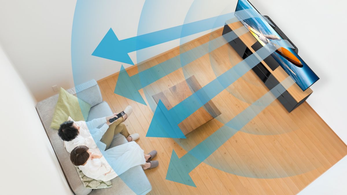 音質面では、画面の上下にスピーカーを配置した「AROUND SPEAKER SYSTEM PLUS」により、映像を音で包み込むような立体的な音場を再現します。例えば、スポーツ観戦ではまるで観客席にいるような臨場感を味わうことができます。