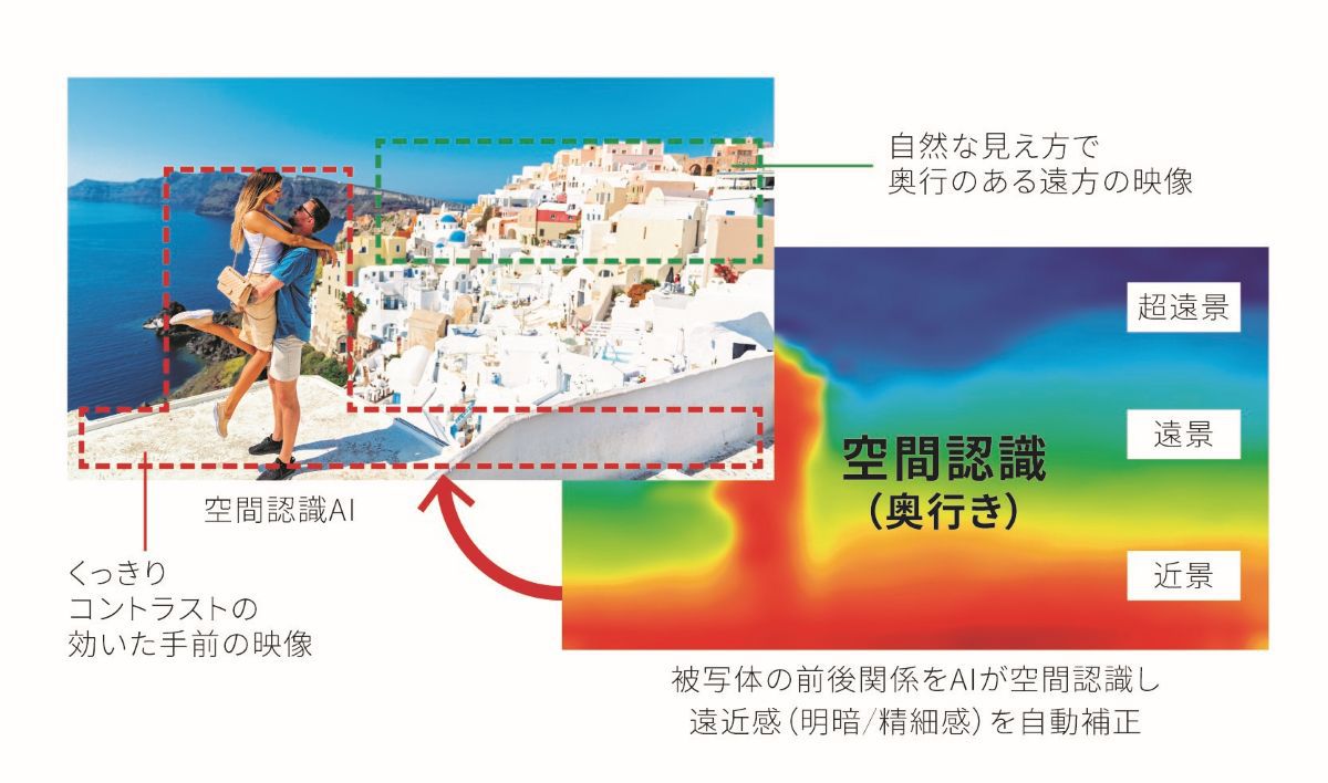 例えば自然や町並みなどの風景は、人の目では遠いところはぼやけて見えます。超解像度技術で画面全体の精彩感を均一に高めると、遠くまでくっきりと見えてしまいます。ぱっと見はきれいですが、自然さは失われます。新搭載の「空間認識AI」が、被写体の遠近を認識し、明暗と精彩感の強弱を使い分けることで、その場にいるような自然な奥行きを復元します。「AIオート」を初めて搭載してから4年目を迎えますが、毎年新しい技術を取り入れています。今後もさらに使いやすいものへと進化させていきたいと考えています。