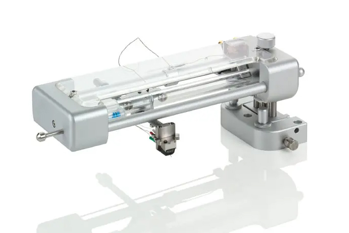 再生方式は実にシンプル。カートリッジを取り付ける短いアームをキャリッジと呼び、水平のガラス棒がガイドとなり、滑らかに移動する方式だ。レコードのカッティング・ヘッドと同じように移動するため、トラッキングエラーが無くアンチスケーティングも不要になる。