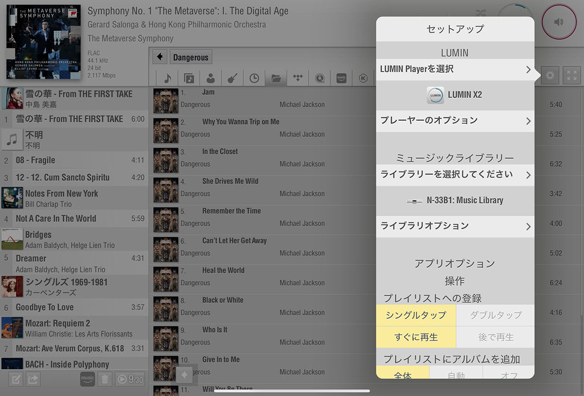 ルーミンの本拠地が香港ということもあり、タブレットから香港の映画音楽作曲家、エリオット・レオンによる現代の交響曲「メタバース・シンフォニー」をセレクト。この楽曲は弱音部から強奏部にかけて様々な楽器が折り重なり、スペクタクルなサウンドへと変貌する様が聴きどころであり、製品評価のチェックポイントだ。