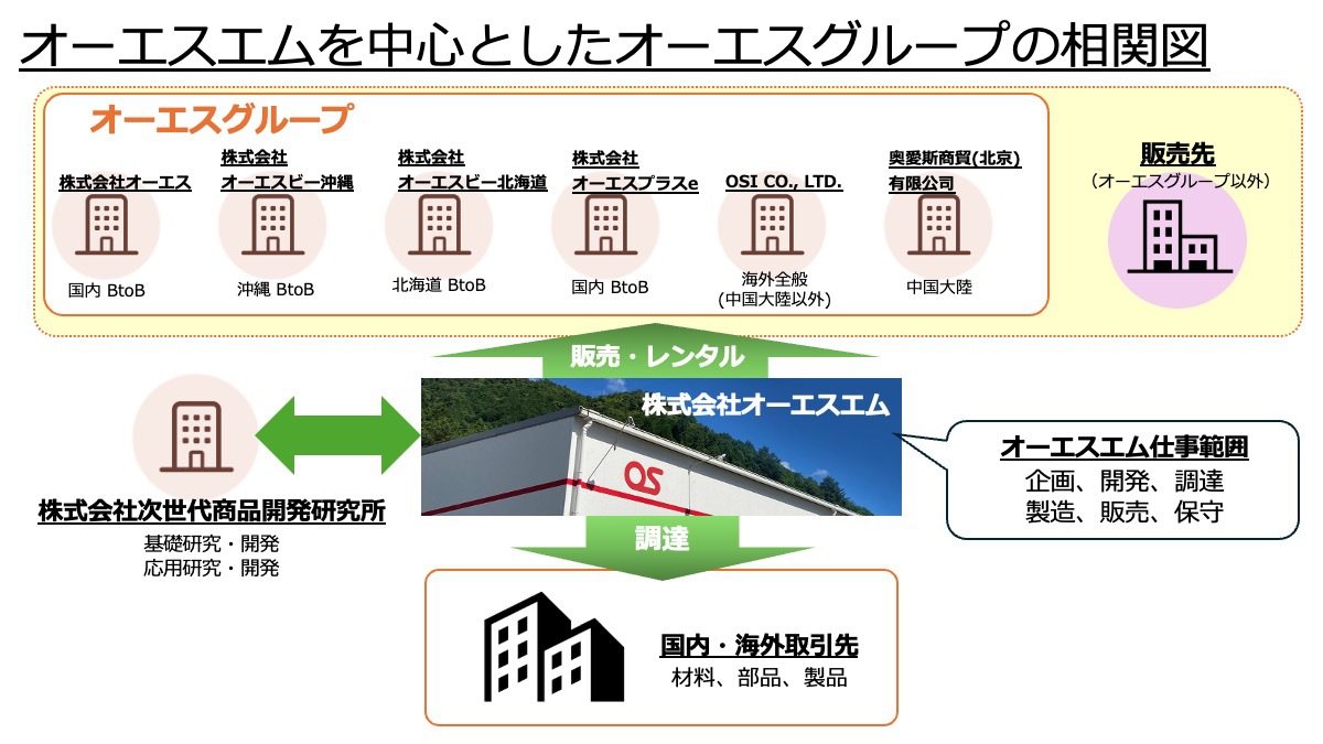 現在はオーエスグループとして国内6社、海外2社の拠点を構え、それぞれで国内外のビジネス、基礎研究・応用研究といった業務を分担している。その中で製品の企画/開発/調達/製造/販売/保守といった業務を担当しているのが株式会社オーエスエムだ。