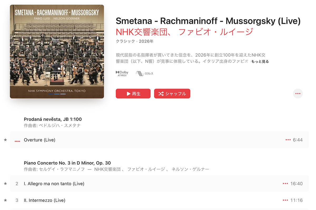 2月18日に配信がスタートしたラフマニノフのピアノ協奏曲第3番を中心とするN響の第一弾のプログラムは、指揮にファビオ・ルイージ、ピアノ独奏にネルソン・ゲルナーを迎えて2024年12月にサントリーホールで行われた定期公演のライヴ収録音源で、ムソルグスキー「展覧会の絵」(ラヴェル編)とスメタナ「売られた花嫁」序曲とともに一公演まるごとロスレスまたは空間オーディオで楽しむことができる。