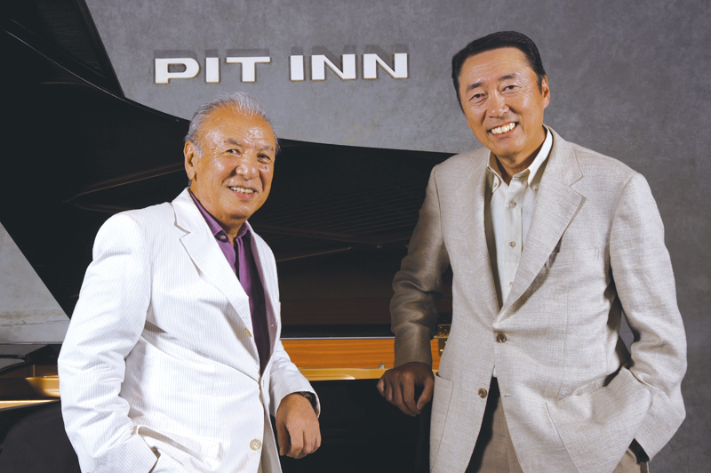 「新宿ピットイン」のステージの上で写真に収まる渡辺貞夫さんと佐藤良武さん。この二人の運命的な出会いがあってこそ、「ピットイン」は現在までの長い歴史を刻むことができたといえるだろう