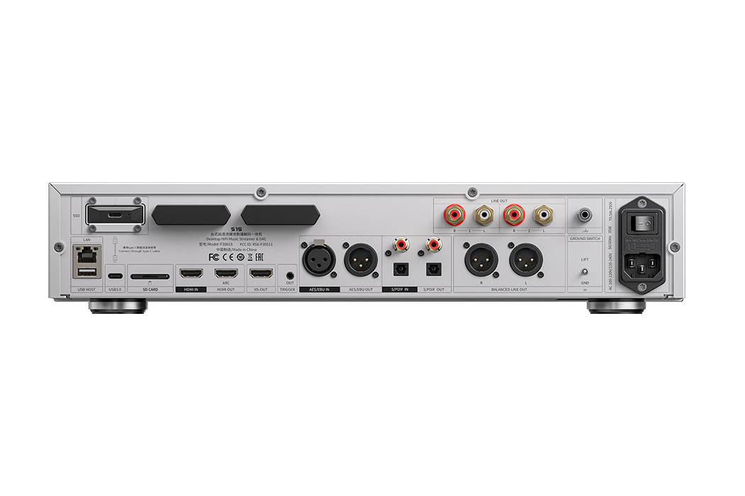 S15の背面端子。RCA・XLRのアナログ出力のほか、各種デジタル出力も搭載。ARC対応のHDMI端子も搭載しており、テレビとの連携も可能