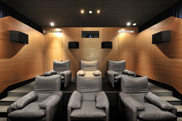 プロジェクター側を臨む。プロジェクターは映写室のように頭上背後を掘り込んで設置。ダイポールタイプのスピーカーを4本壁掛け設置して、サラウンド音場を豊かに演出する