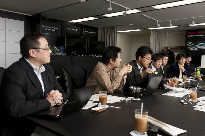 東芝の視聴ルームでインタビューを行った。写真手前がレグザサーバー担当の澤岡氏