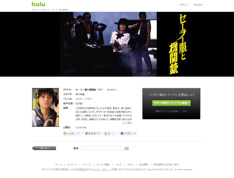 『セーラー服と機関銃』(映画)/日本映画のセレクションも充実するHuluの名作コンテンツの中でも人気の高い、薬師丸ひろ子主演作
